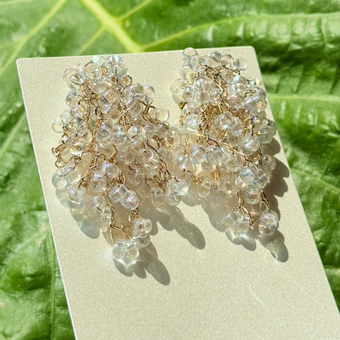 淡い色合いのビーズを巧みに編み上げ、夜空に浮かぶオーロラのような美しさを表現したピアス。