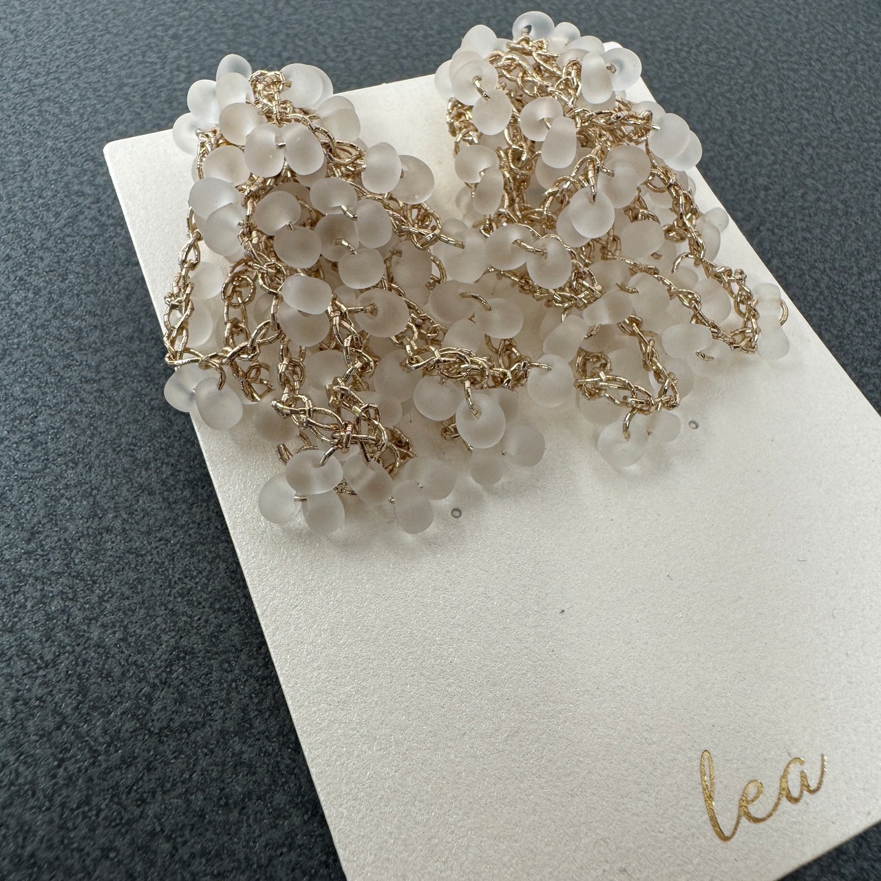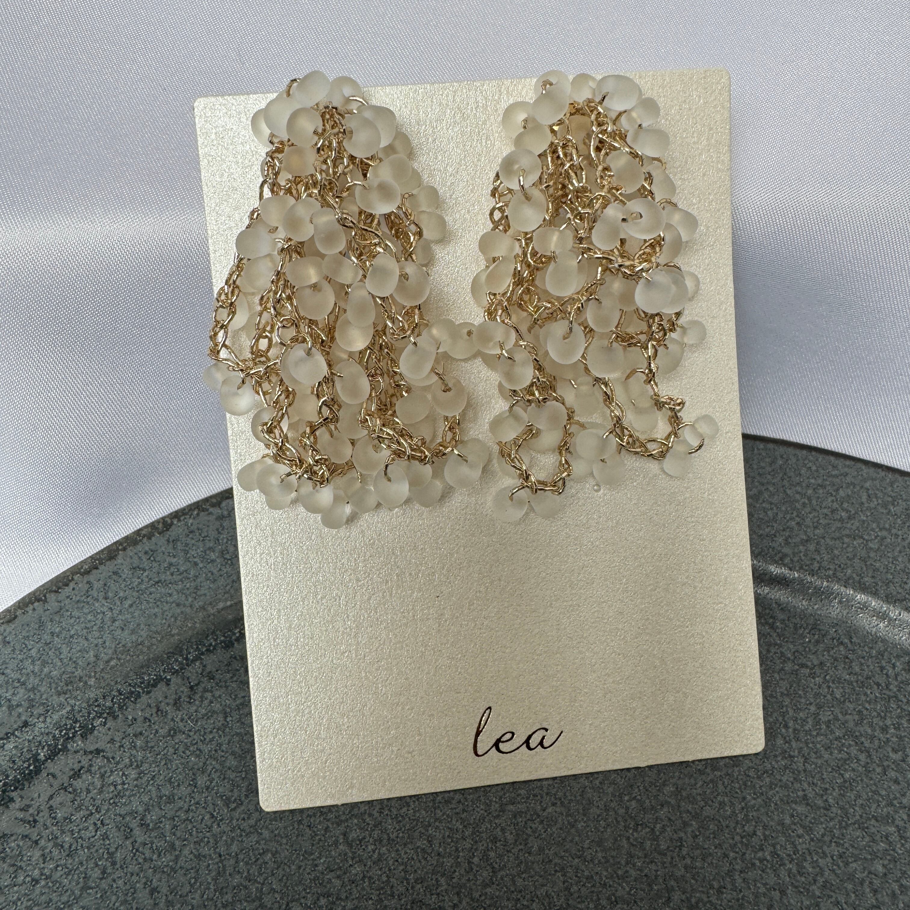 くすみホワイトのビーズを贅沢に使用し、まるで花が bloom(開花)するかのような華やかさを演出したイヤリング。