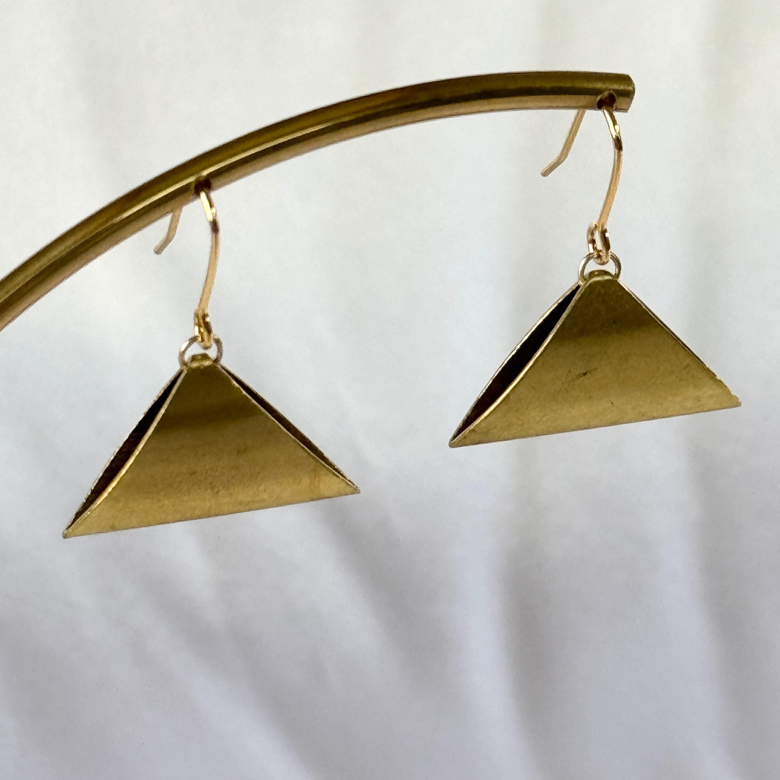 シャープなフォルムが印象的な、ゴールドのトライアングルアクセサリー。